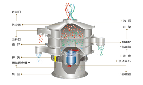 三次元圆形妖精视频网站入口采用YZUL立式振动电机作为激振源,通过振动电机上下两端的偏心重锤将旋转运动转变为水平、垂直、倾斜的三次元运动,并传递到妖精视频网站入口的筛面上;物料通过入料口进入设备内,根据不同物料筛分要求,物料经过1-5层采用不同目数的金属编织筛网的筛分层,在这个过程中,位于各层的筛网下的清网装置(弹跳球)通过频率振动不断撞击不锈钢筛网,使筛网上层物料能够顺畅的透网筛分,并有效解决了物料堵网问题出现,不同目数的物料通过各层对应目数的筛网后在各层的出料口排出,终实现筛选除杂或过滤分级的目的。